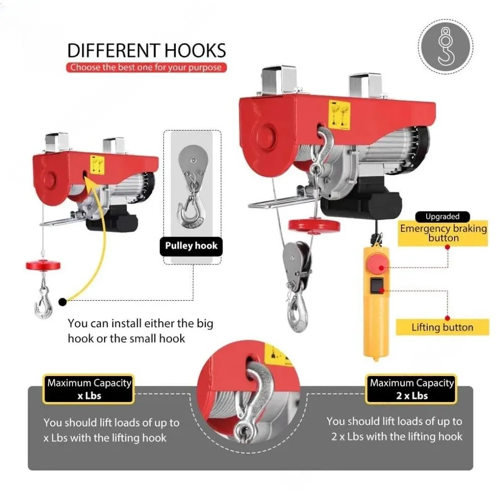The motor with overload protection prevents itself from overheating Pulley with lifting hook